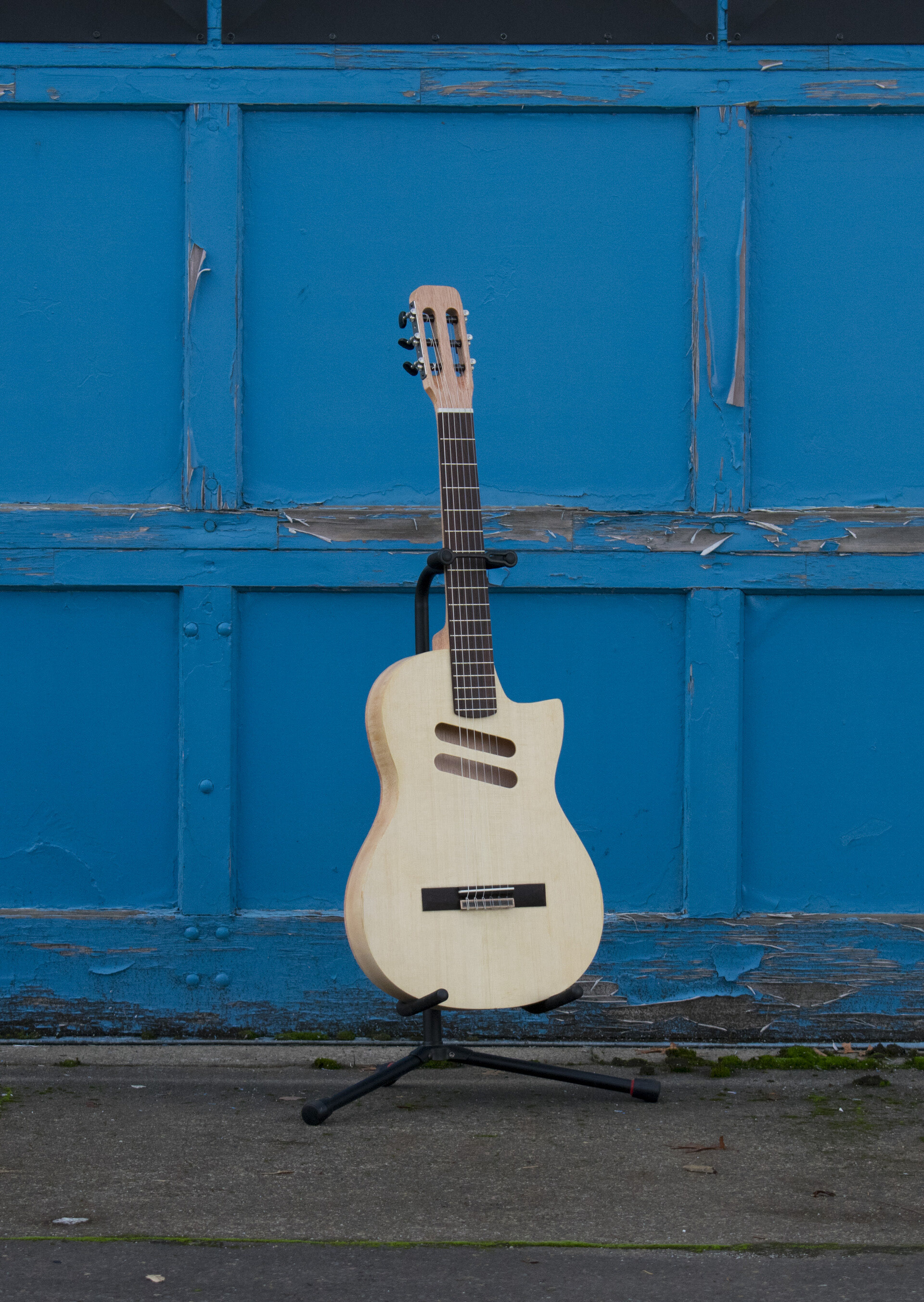 A thin-bodied classical guitar. The body is maple, with a mahogany back and neck, spruce soundboard, and rosewood fretboard.